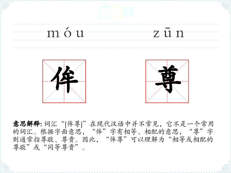 - 词源:“侔”字源自古代汉语,意为相等;“尊”字同样源自古代汉语,意为尊敬。