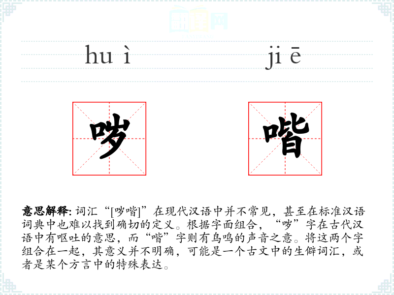 词汇“[哕喈]”在现代汉语中并不常见,甚至在标准汉语词典中也难以找到确切的定义。根据字面组合,“哕”字在古代汉语中有呕吐的意思,而“喈”字则有鸟鸣的声音之意。将这两个字组合在一起,其意义并不明确,可能是一个古文中的生僻词汇,或者是某个方言中的特殊表达。