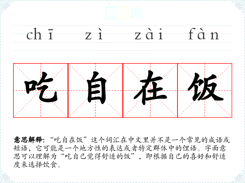 “吃自在饭”这个词汇在中文里并不是一个常见的成语或短语,它可能是一个地方性的表达或者特定群体中的俚语。字面意思可以理解为“吃自己觉得舒适的饭”,即根据自己的喜好和舒适度来选择饮食。