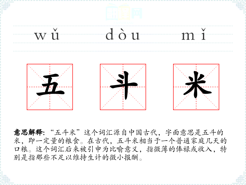 “五斗米”这个词汇源自*古代,字面意思是五斗的米,即一定量的粮食。在古代,五斗米相当于一个普通家庭几天的口粮。这个词汇后来被引申为比喻意义,指微的俸禄或收入,特别是指那些不足以维持生计的微小报酬。
