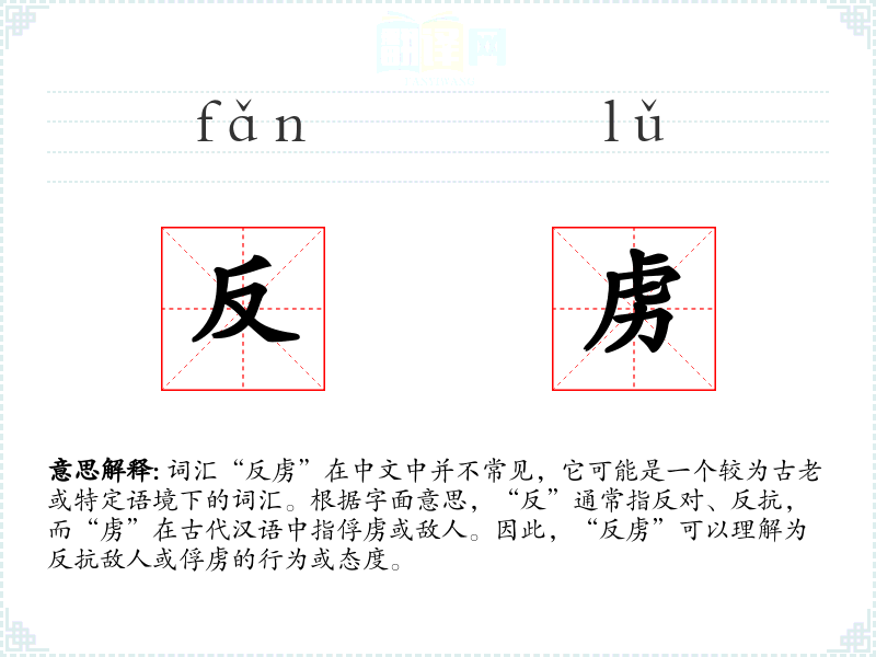 词汇“反虏”在中文中并不常见,它可能是一个较为古老或特定语境下的词汇。根据字面意思,“反”通常指反对、反抗,而“虏”在古代汉语中指俘虏或敌人。因此,“反虏”可以理解为反抗敌人或俘虏的行为或态度。