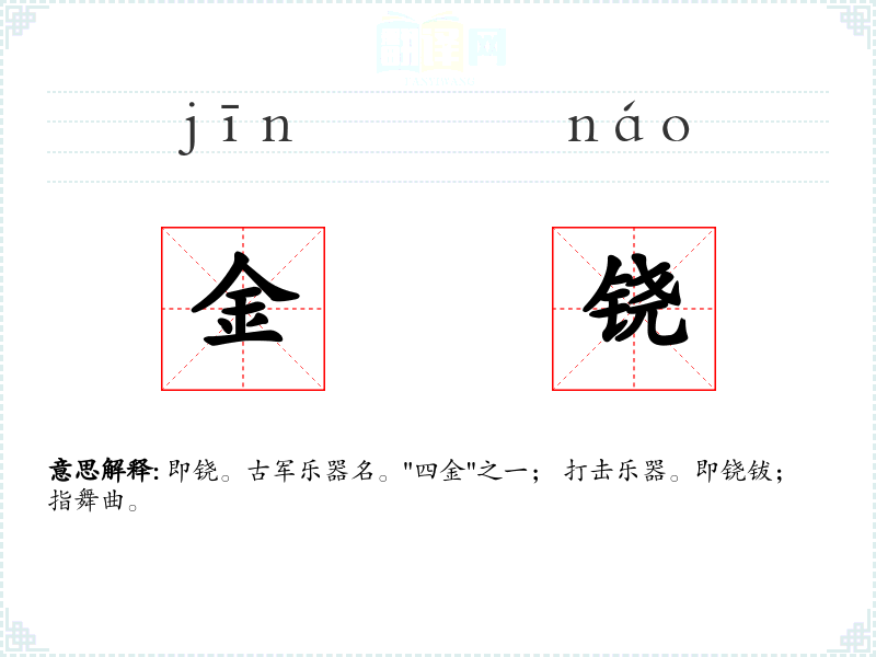 即铙。古军乐器名。"四金"之一; 打击乐器。即铙钹; 指舞曲。