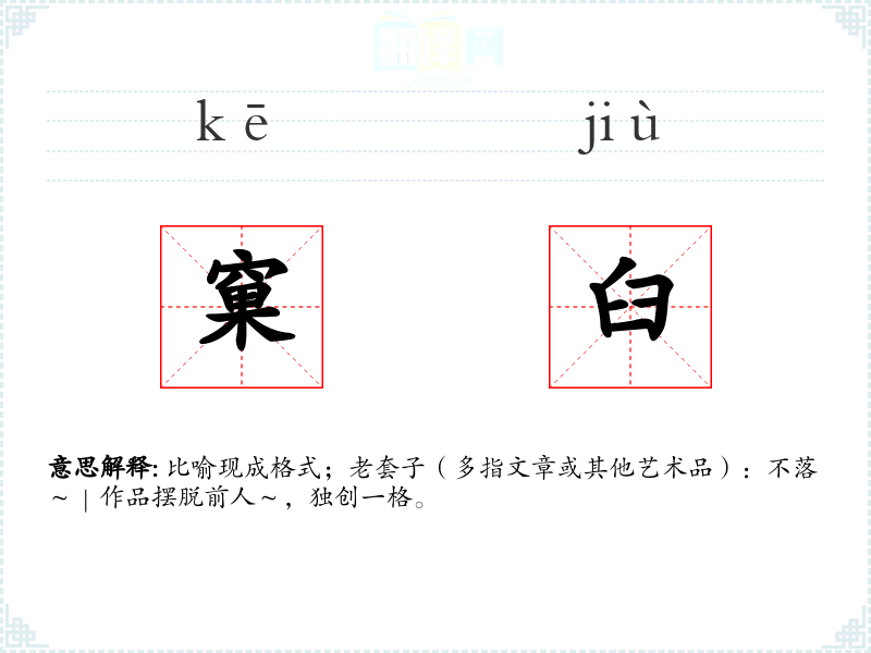 比喻现成格式;老套子(多指文章或其他艺术品):不落~|作品摆脱前人~,独创一格。