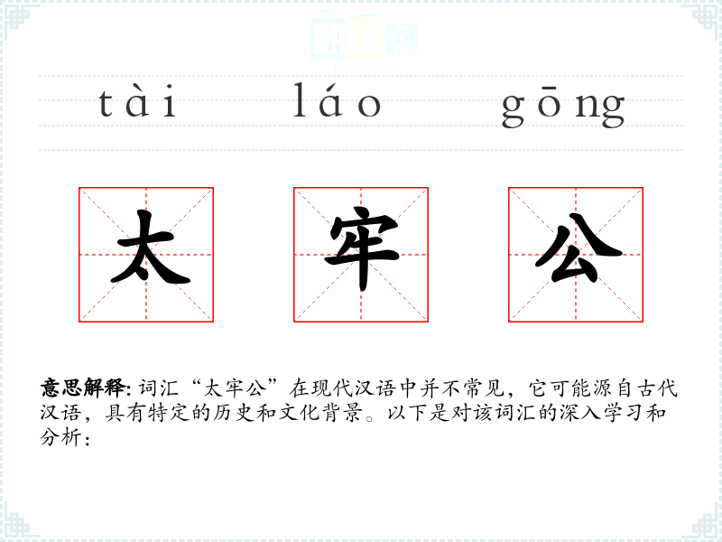 词汇“太牢公”在现代汉语中并不常见,它可能源自古代汉语,具有特定的历史和文化背景。以下是对该词汇的深入学*和分析:
