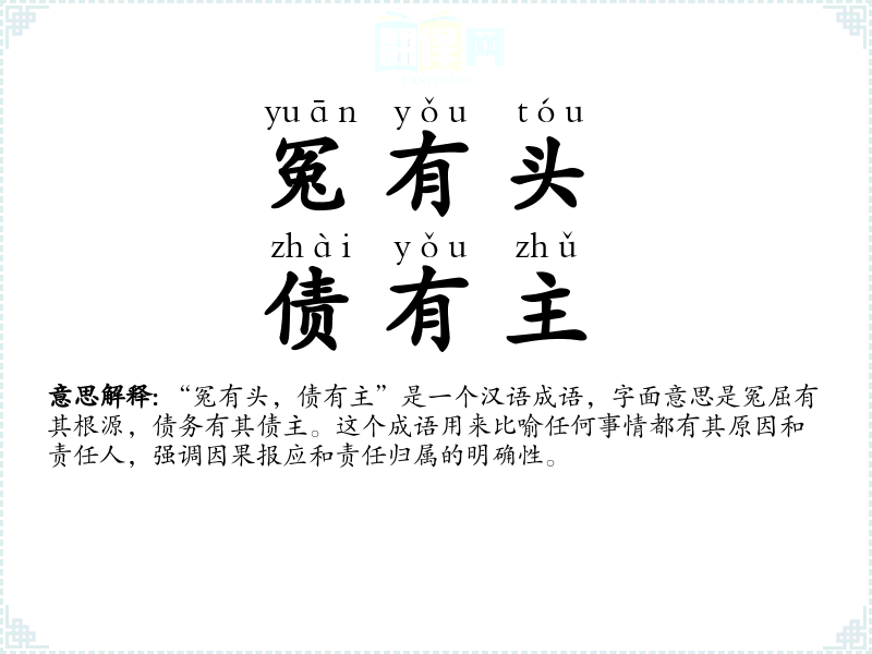 “冤有头,债有主”是一个汉语成语,字面意思是冤屈有其根源,债务有其债主。这个成语用来比喻任何事情都有其原因和责任人,强调因果报应和责任归属的明确性。