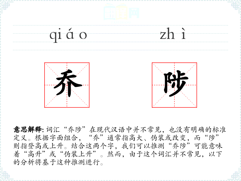 词汇“乔陟”在现代汉语中并不常见,也没有明确的标准定义。根据字面组合,“乔”通常指高大、伪装或改变,而“陟”则指登高或上升。结合这两个字,我们可以推测“乔陟”可能意味着“高升”或“伪装上升”。然而,由于这个词汇并不常见,以下的分析将基于这种推测进行。