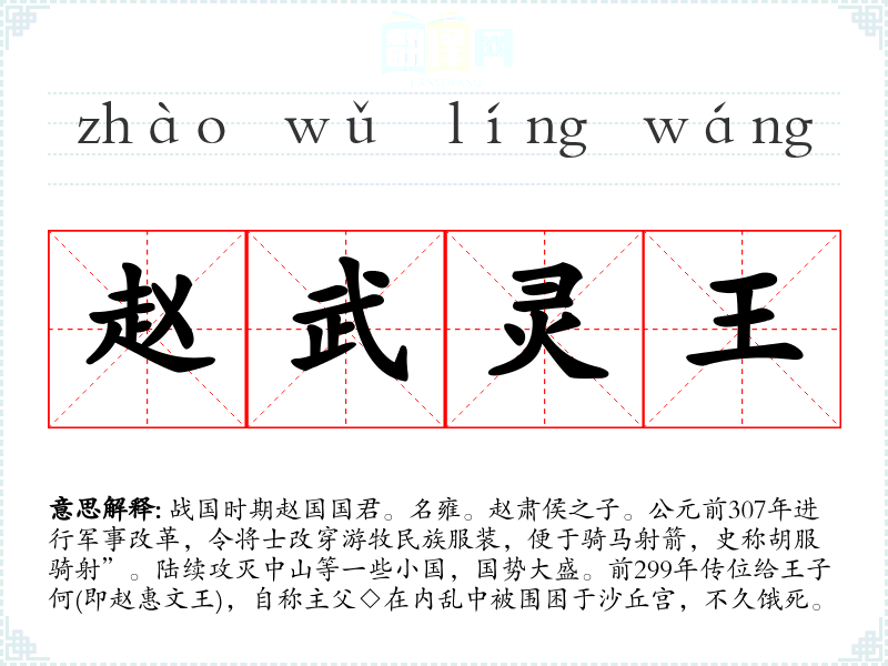 1.战国时期赵国国君。名雍。赵肃侯之子。公元前307年进行军事改革,令将士改穿游牧民族服装,便于骑马射箭,史称胡服骑射”。陆续攻灭中山等一些小国,国势大盛。前299年传位给王子何(即赵惠文王),自称主父◇在内乱中被围困于沙丘宫,不久饿死。