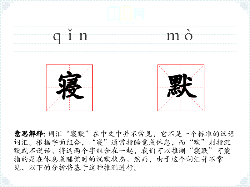 词汇“寝默”在中文中并不常见,它不是一个标准的汉语词汇。根据字面组合,“寝”通常指睡觉或休息,而“默”则指沉默或不说话。将这两个字组合在一起,我们可以推测“寝默”可能指的是在休息或睡觉时的沉默状态。然而,由于这个词汇并不常见,以下的分析将基于这种推测进行。