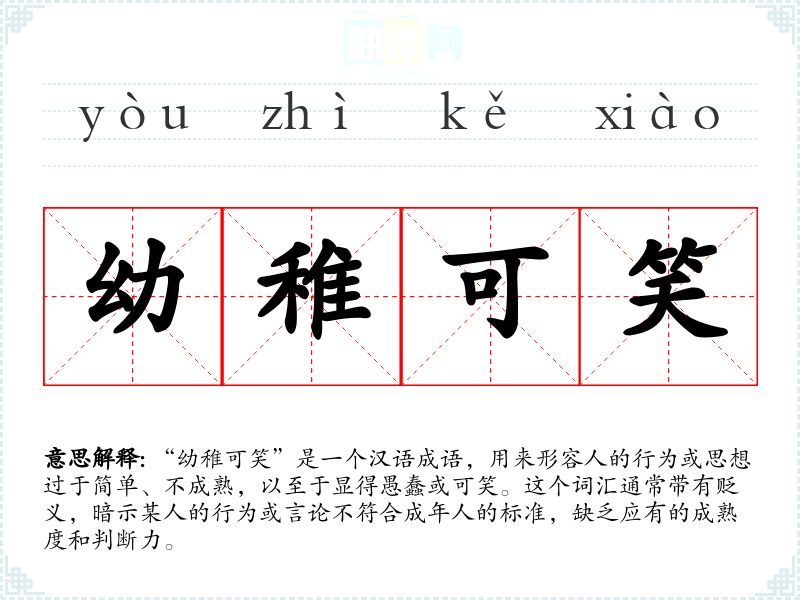 “幼稚可笑”是一个汉语成语,用来形容人的行为或思想过于简单、不成熟,以至于显得愚蠢或可笑。这个词汇通常带有贬义,暗示某人的行为或言论不符合成年人的标准,缺乏应有的成熟度和判断力。
