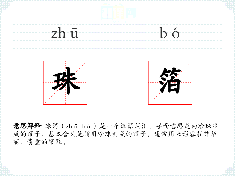 珠箔(zhū bó)是一个汉语词汇,字面意思是由珍珠串成的帘子。基本含义是指用珍珠制成的帘子,通常用来形容装饰华丽、贵重的帘幕。