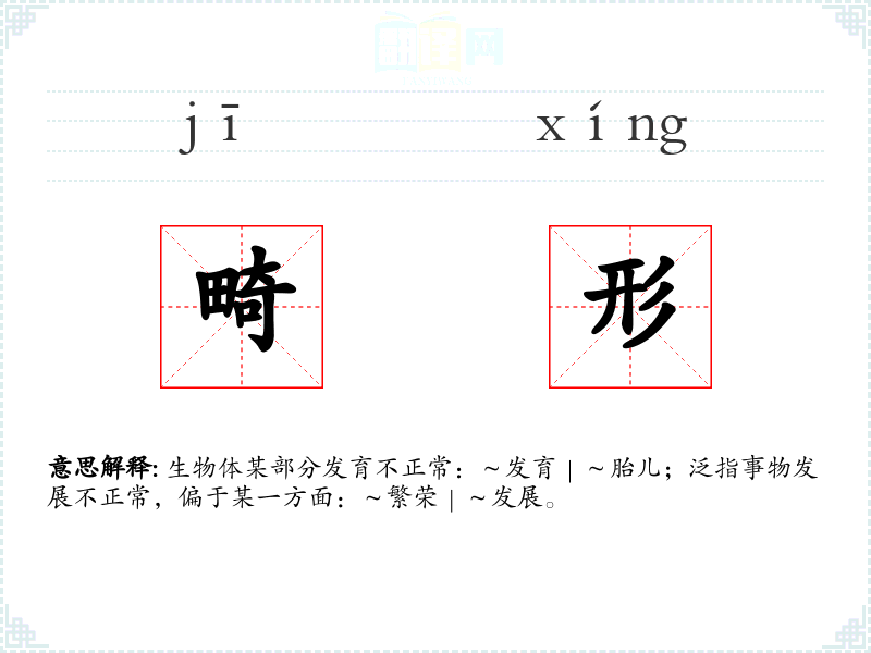 生物体某部分发育不正常:~发育|~胎儿;泛指事物发展不正常,偏于某一方面:~繁荣|~发展。