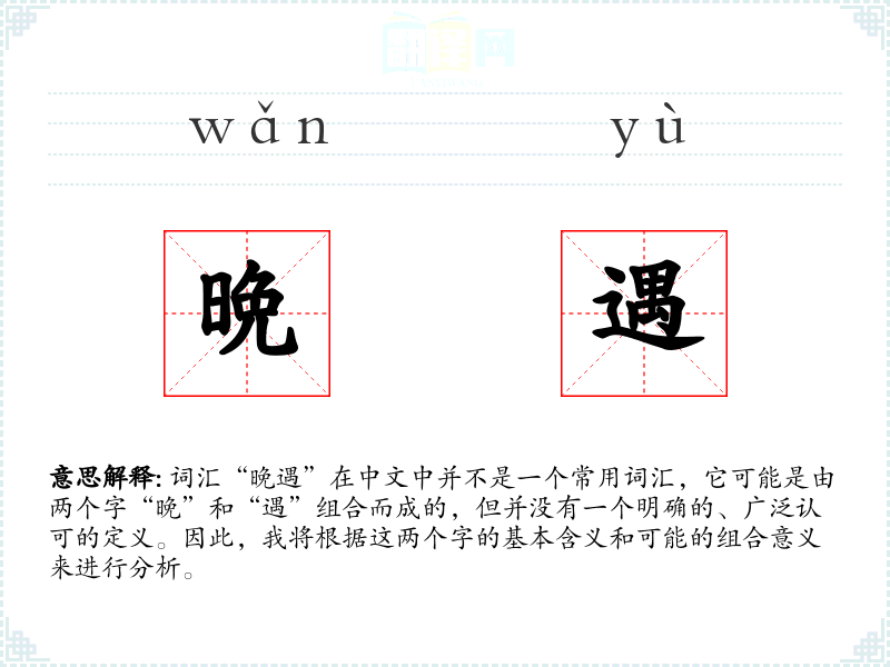 词汇“晚遇”在中文中并不是一个常用词汇,它可能是由两个字“晚”和“遇”组合而成的,但并没有一个明确的、广泛认可的定义。因此,我将根据这两个字的基本含义和可能的组合意义来进行分析。