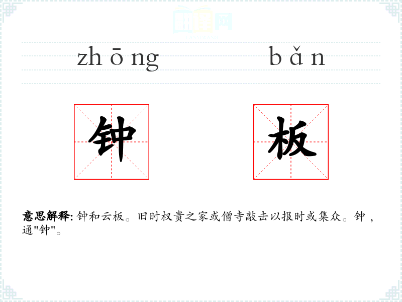 钟和云板。旧时权贵之家或僧寺敲击以报时或集众。钟﹐通"钟"。