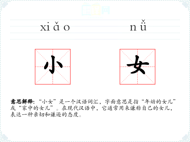 - 口语:在日常对话中,父母或长辈可能会用“小女”来指代自己的女儿,尤其是在需要表达谦逊或客气时。