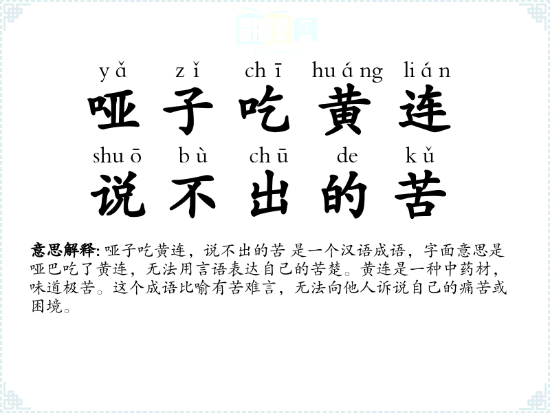哑子吃黄连,说不出的苦 是一个汉语成语,字面意思是哑巴吃了黄连,无法用言语表达自己的苦楚。黄连是一种中药材,味道极苦。这个成语比喻有苦难言,无法向他人诉说自己的痛苦或困境。