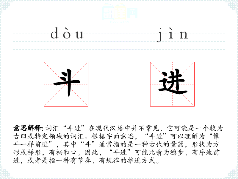 “斗进”的基本含义可能是指一种有序、有节奏的前进或进展方式,类似于斗的形状和使用方式。