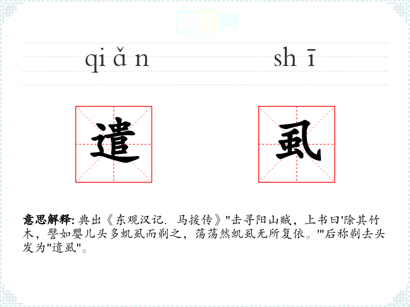 典出《东观汉记.马援传》"击寻阳山贼,上书曰'除其竹木,譬如婴儿头多虮虱而剃之,荡荡然虮虱无所复依。'"后称剃去头发为"遣虱"。