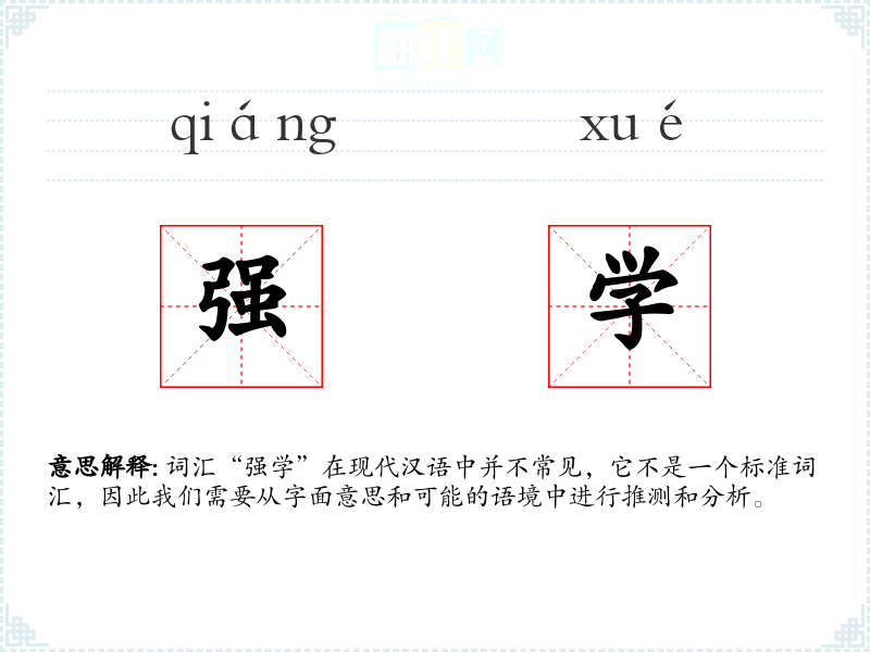 词汇“强学”在现代汉语中并不常见,它不是一个标准词汇,因此我们需要从字面意思和可能的语境中进行推测和分析。