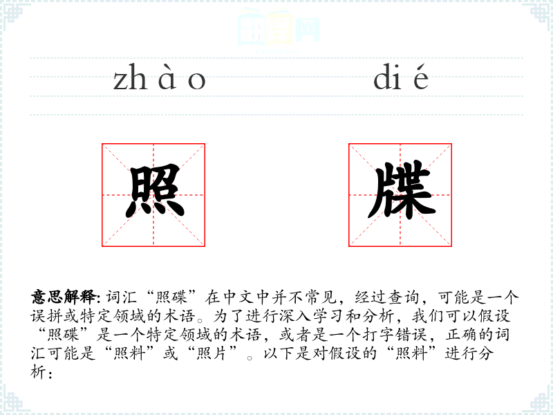 词汇“照碟”在中文中并不常见,经过查询,可能是一个误拼或特定领域的术语。为了进行深入学习和分析,我们可以假设“照碟”是一个特定领域的术语,或者是一个打字错误,正确的词汇可能是“照料”或“照片”。以下是对假设的“照料”进行分析: