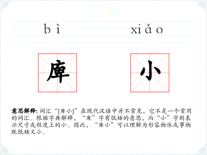 词汇“[庳小]”在现代汉语中并不常见,它不是一个常用的词汇。根据字典解释,“庳”字有低矮的意思,而“小”字则表示尺寸或程度上的小。因此,“庳小”可以理解为形容物体或事物既低矮又小。