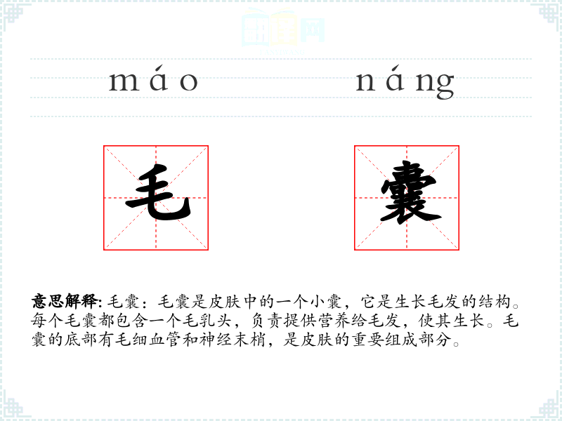 “毛囊”一词源自汉语,由“毛”和“囊”两个字组成。在古代汉语中,“囊”指的是袋子或容器,而“毛”则指毛发。随着医学的发展,这个词在现代汉语中被广泛用于描述皮肤结构。