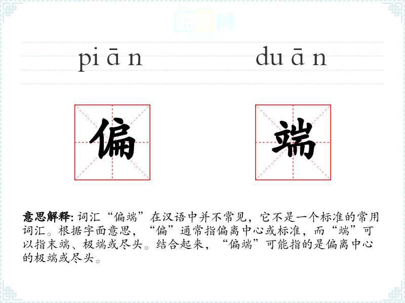- 由于“偏端”不是一个常用词汇,其词源和演变不太明确。可能是由“偏”和“端”两个常用词汇组合而成,用以描述偏离中心的极端状态。