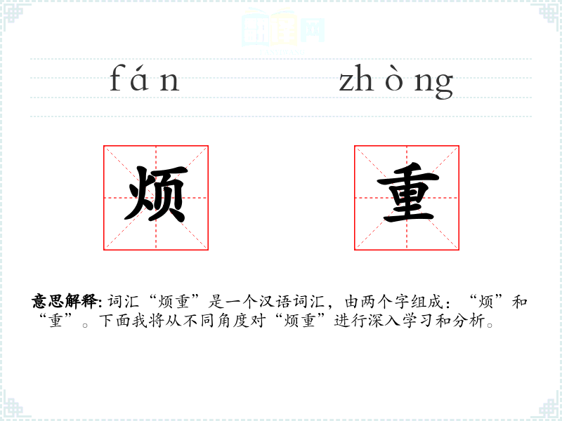词汇“烦重”是一个汉语词汇,由两个字组成:“烦”和“重”。下面我将从不同角度对“烦重”进行深入学*和分析。