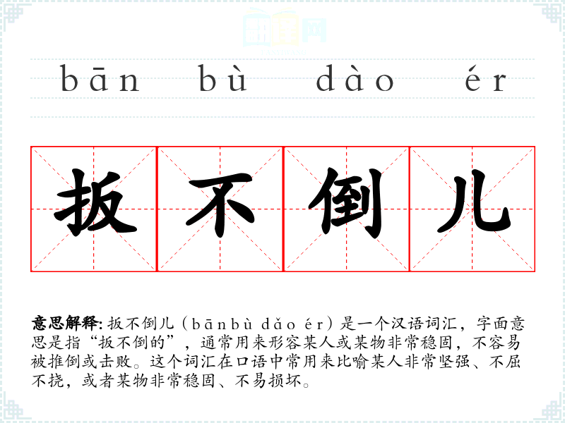 扳不倒儿(bān bù dǎo ér)是一个汉语词汇,字面意思是指“扳不倒的”,通常用来形容某人或某物非常稳固,不容易被推倒或击败。这个词汇在口语中常用来比喻某人非常坚强、不屈不挠,或者某物非常稳固、不易损坏。