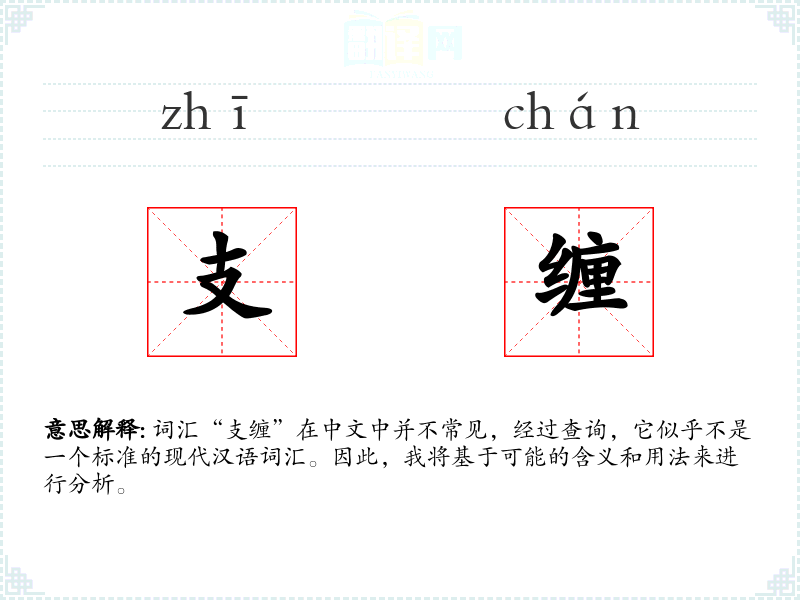 词汇“支缠”在中文中并不常见,经过查询,它似乎不是一个标准的现代汉语词汇。因此,我将基于可能的含义和用法来进行分析。