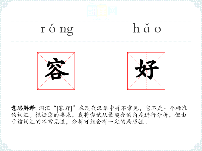 词汇“[容好]”在现代汉语中并不常见,它不是一个标准的词汇。根据您的要求,我将尝试从最契合的角度进行分析,但由于该词汇的不常见性,分析可能会有一定的局限性。