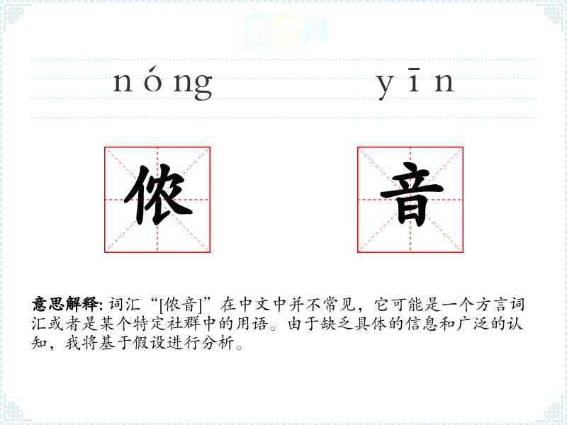 词汇“[侬音]”在中文中并不常见,它可能是一个方言词汇或者是某个特定社群中的用语。由于缺乏具体的信息和广泛的认知,我将基于假设进行分析。