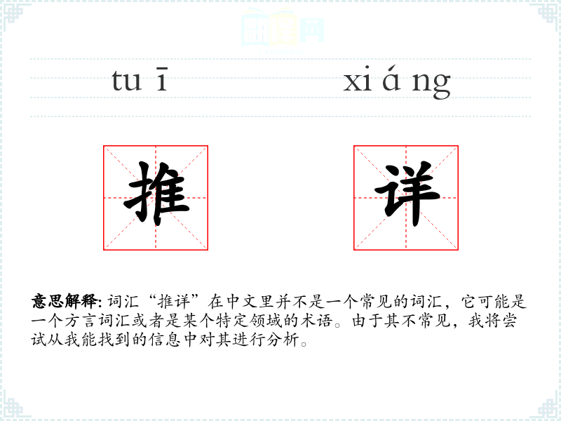如果“推详”是一个方言词汇,它可能反映了该方言社区的特定文化和语言习惯。在特定的社会背景下,这样的词汇可能被用来表达对该社区重要的事物的深入理解和尊重。