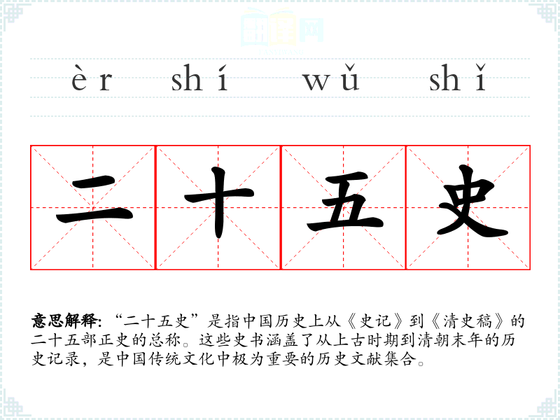 “二十五史”是指历史上从《史记》到《清史稿》的二十五部正史的总称。这些史书涵盖了从上古时期到清朝末年的历史记录,是传统文化中极为重要的历史文献集合。