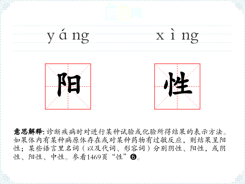 1.诊断疾病时对进行某种试验或化验所得结果的表示方法。如果体内有某种病原体存在或对某种药物有过敏反应,则结果呈阳性;某些语言里名词(以及代词、形容词)分别阴性、阳性,或阴性、阳性、中性。参看1469页“性”➏。