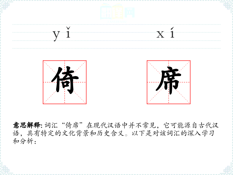 词汇“倚席”在现代汉语中并不常见,它可能源自古代汉语,具有特定的文化背景和历史含义。以下是对该词汇的深入学*和分析: