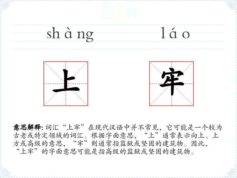 词汇“上牢”在现代汉语中并不常见,它可能是一个较为古老或特定领域的词汇。根据字面意思,“上”通常表示向上、上方或高级的意思,“牢”则通常指监狱或坚固的建筑物。因此,“上牢”的字面意思可能是指高级的监狱或坚固的建筑物。