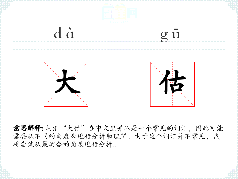 词汇“大估”在中文里并不是一个常见的词汇,因此可能需要从不同的角度来进行分析和理解。由于这个词汇并不常见,我将尝试从最契合的角度进行分析。