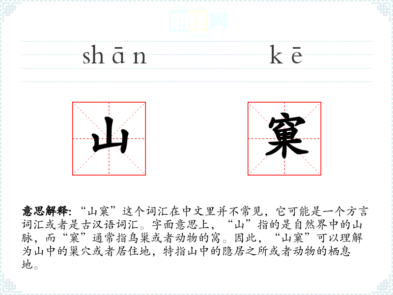 “山窠”这个词汇在中文里并不常见,它可能是一个方言词汇或者是古汉语词汇。字面意思上,“山”指的是自然界中的山脉,而“窠”通常指鸟巢或者动物的窝。因此,“山窠”可以理解为山中的巢穴或者居住地,特指山中的隐居之所或者动物的栖息地。