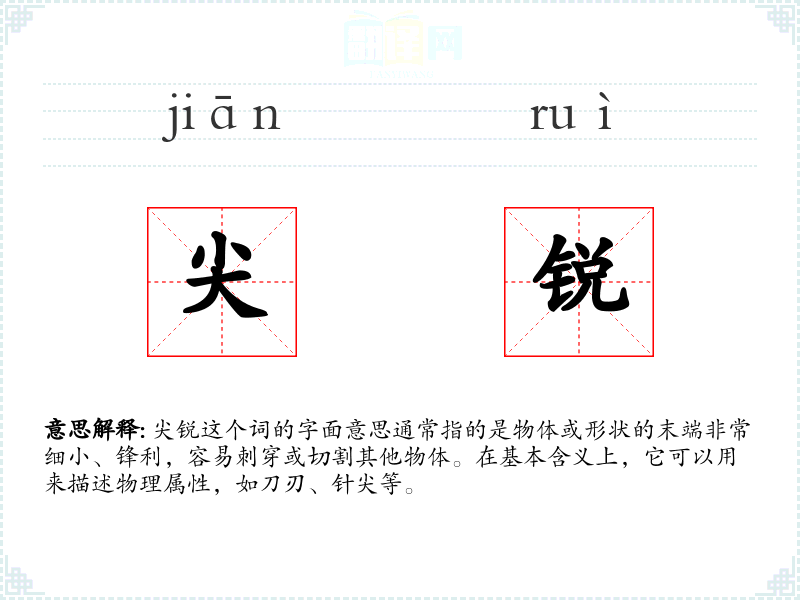 尖锐这个词的字面意思通常指的是物体或形状的末端非常细小、锋利,容易刺穿或切割其他物体。在基本含义上,它可以用来描述物理属性,如刀刃、针尖等。