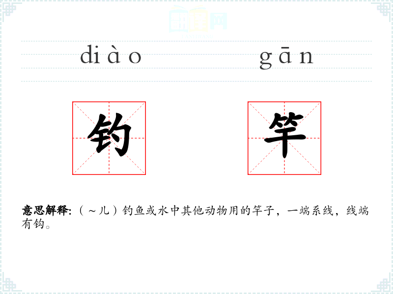 (~儿)钓鱼或水中其他动物用的竿子,一端系线,线端有钩。