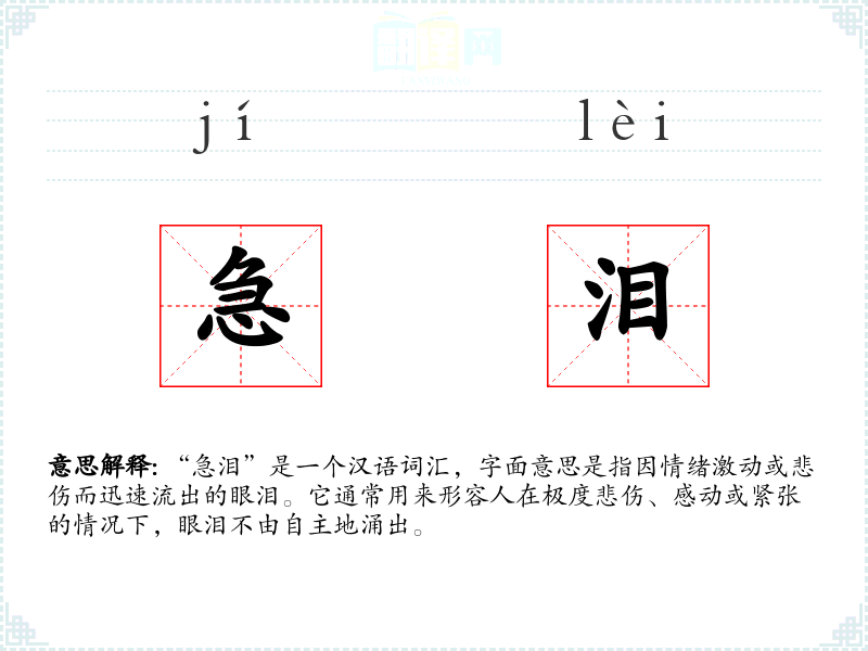 - 反义词:笑容、欢笑(这些词汇与“急泪”形成情感上的对比)