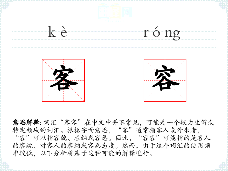 词汇“客容”在中文中并不常见,可能是一个较为生僻或特定领域的词汇。根据字面意思,“客”通常指客人或外来者,“容”可以指容貌、容纳或容忍。因此,“客容”可能指的是客人的容貌、对客人的容纳或容忍态度。然而,由于这个词汇的使用频率较低,以下分析将基于这种可能的解释进行。