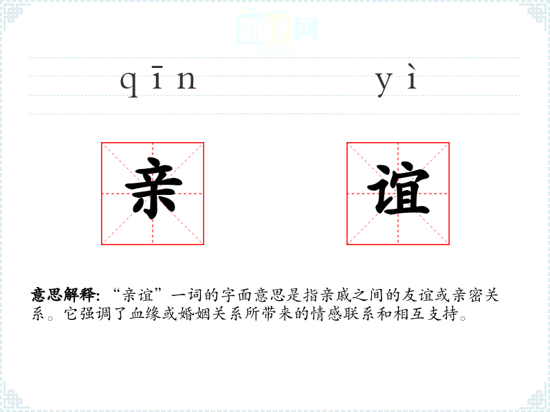 “亲谊”一词的字面意思是指亲戚之间的友谊或亲密关系。它强调了血缘或婚姻关系所带来的情感联系和相互支持。