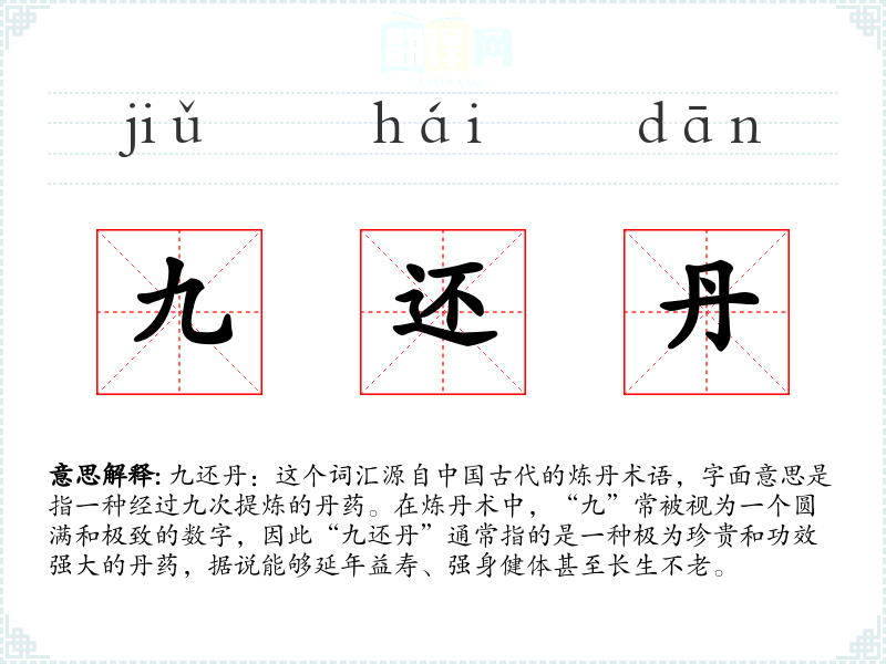 - 专业领域:在中医药或炼丹术的专业领域中,九还丹可能指的是一种特定的药材配方或炼制方法。
