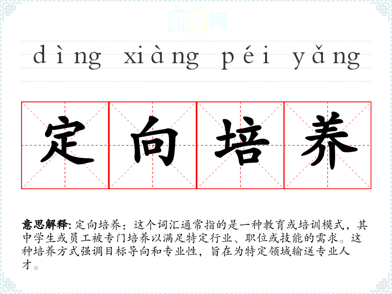 定向培养:这个词汇通常指的是一种教育或培训模式,其中学生或员工被专门培养以满足特定行业、职位或技能的需求。这种培养方式强调目标导向和专业性,旨在为特定领域输送专业人才。