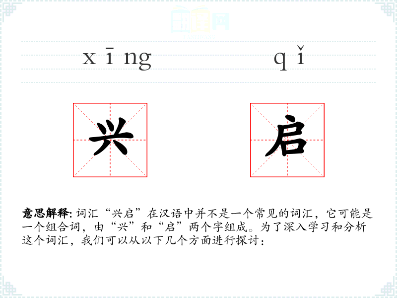通过对“兴启”的分析,我们可以看到它是一个具有积极含义的词汇,常用来形容新事物的开始或旧事物的复兴。在语言学习和表达中,理解和运用这样的词汇可以帮助我们更准确地传达积极向上的信息和情感。