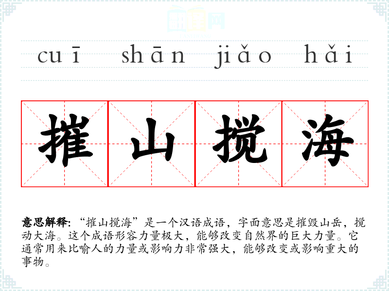 “摧山搅海”这个成语的词源较为模糊,但它显然是从古代对自然力量的敬畏和描述中演变而来的。在古代文学和神话中,经常有描述神灵或英雄具有改变自然界的能力,这个成语可能是从这些描述中抽象出来的。