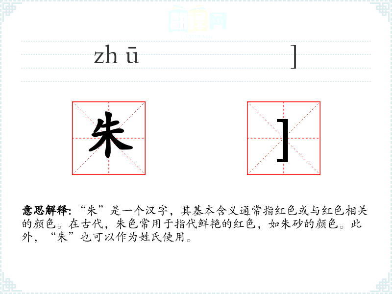 “朱”是一个汉字,其基本含义通常指红色或与红色相关的颜色。在古代,朱色常用于指代鲜艳的红色,如朱砂的颜色。此外,“朱”也可以作为姓氏使用。