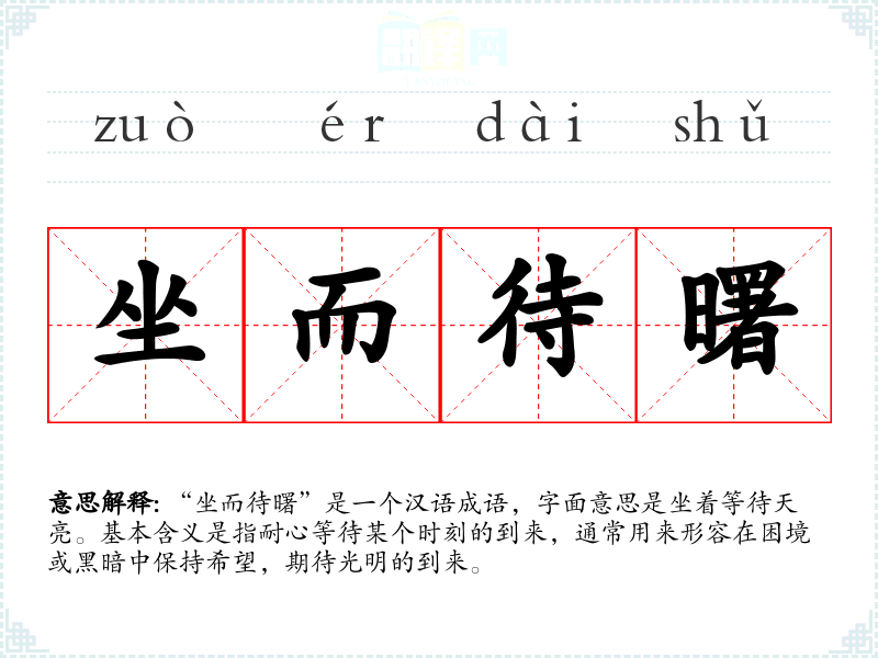 “坐而待曙”是一个汉语成语,字面意思是坐着等待天亮。基本含义是指耐心等待某个时刻的到来,通常用来形容在困境或黑暗中保持希望,期待光明的到来。