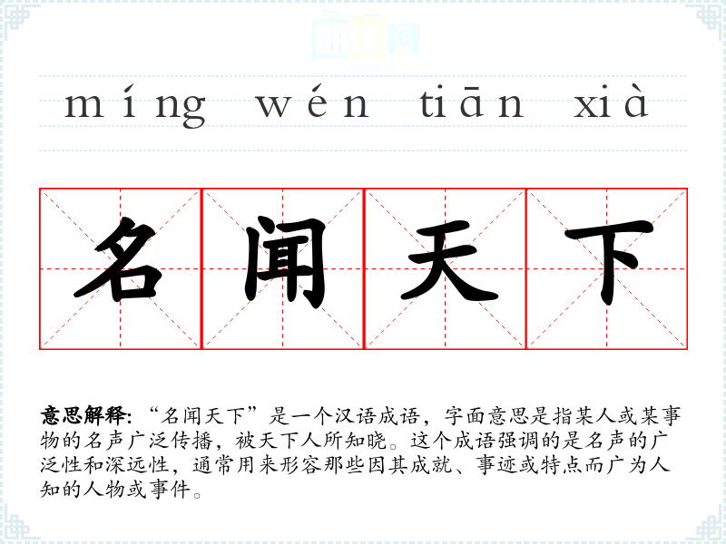 在文学作品中,“名闻天下”常用于描述历史人物、英雄豪杰或文化名人的影响力和知名度。在口语中,这个成语可以用来赞扬某人的成就或名声。在专业领域,如新闻、公关等,这个词汇可能用来描述某个品牌或产品的广泛知名度。